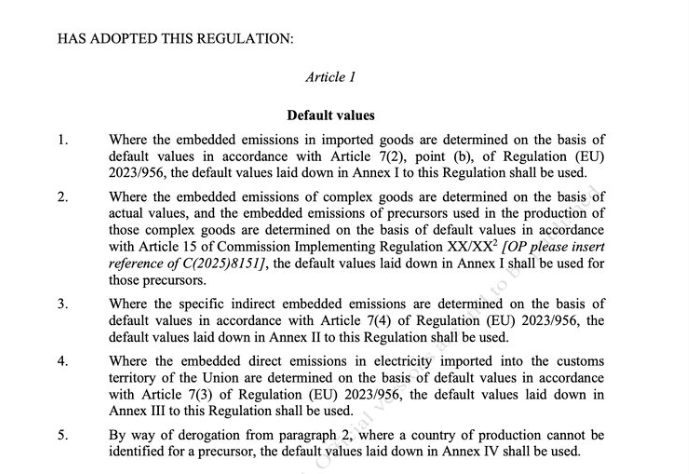 如果出口商无法提供经核查的真实数据,欧盟将套用“默认值(Default Values)”来收税。此前业界普遍预期默认值会根据全球平均水平设定,但12月中旬公布的法案彻底打破了这一幻觉。